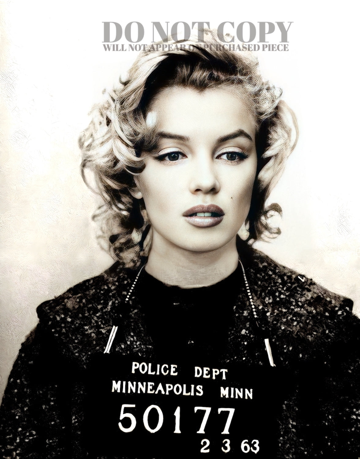 Description: Magnificent mugshot portrait of Marilyn Monroe after she was arrested for peaceful protesting in Minneapolis, Minnesota. Brilliant one-of-a-kind restoration.